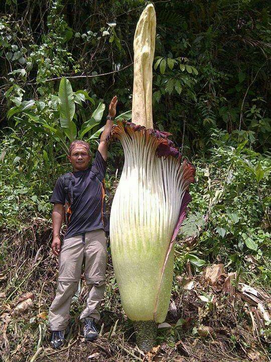 Bunga Titan Arum, yang tingginya dapat mencapai lebih dari tiga meter, merupakan perbungaan tak bercabang terbesar di dunia. Nama umum tanaman ini berasal dari bau busuk yang dikeluarkan selama periode berbunga, yang diibaratkan seperti daging busuk, yang berfungsi untuk menarik kumbang bangkai dan lalat daging untuk penyerbukan.[7]